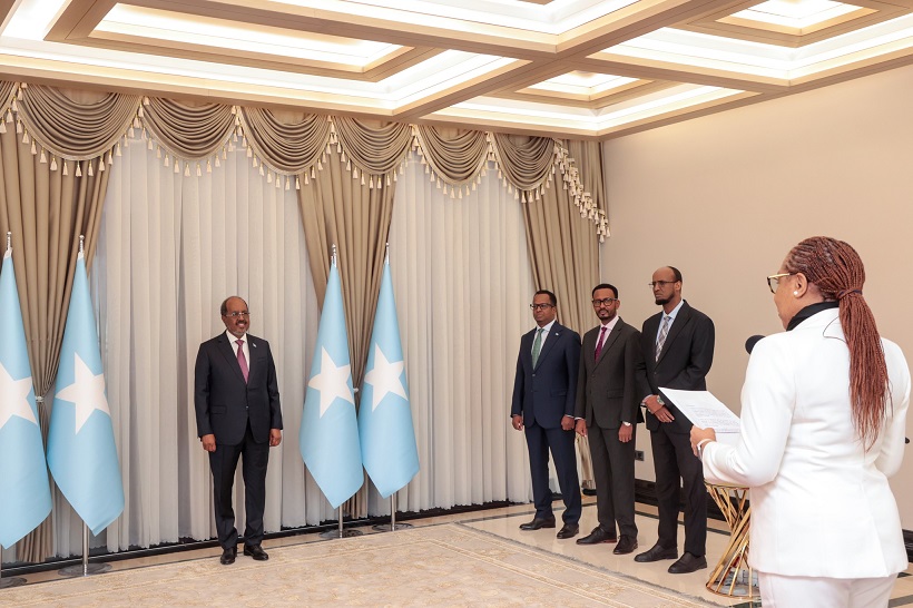 Madaxweynaha ayaa munaasabad ku qabsoomtay Villa Somalia waraaqaha kaga guddoomay Safiiradan, oo saddex ka mid ah ay haween yihiin.