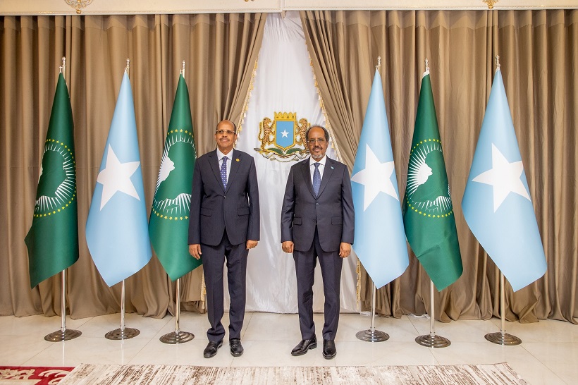 Madaxweynaha Jamhuuriyadda Somaliya, Xasan Sheekh Maxamuud ayaa galabta Madaxtooyada Qaranka ku qaabilay Gudoomiyaha Guddiga Midowga Afrika, Maxamuud Cali Yuusuf oo booqasho ku yimid Magaalada Muqdisho.