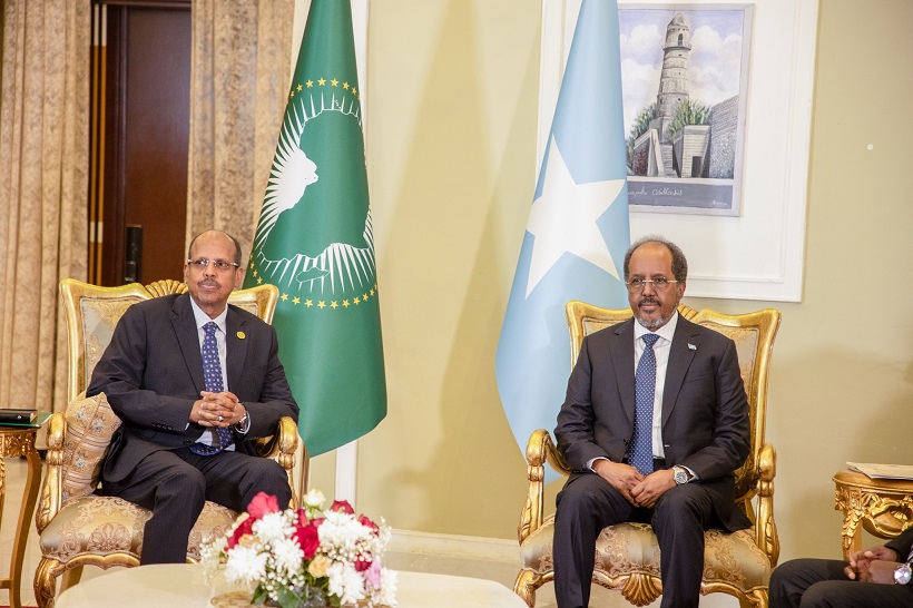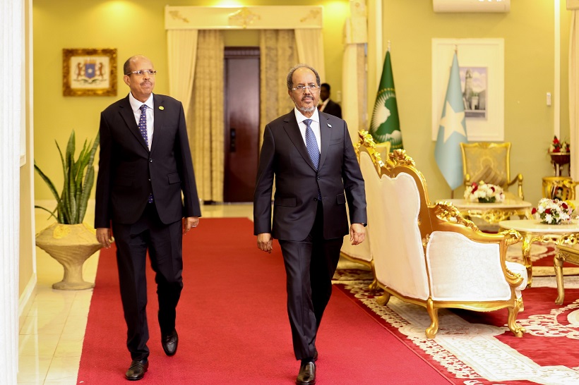 Madaxweynaha Jamhuuriyadda Somaliya, Xasan Sheekh Maxamuud ayaa galabta Madaxtooyada Qaranka ku qaabilay Gudoomiyaha Guddiga Midowga Afrika, Maxamuud Cali Yuusuf oo booqasho ku yimid Magaalada Muqdisho.